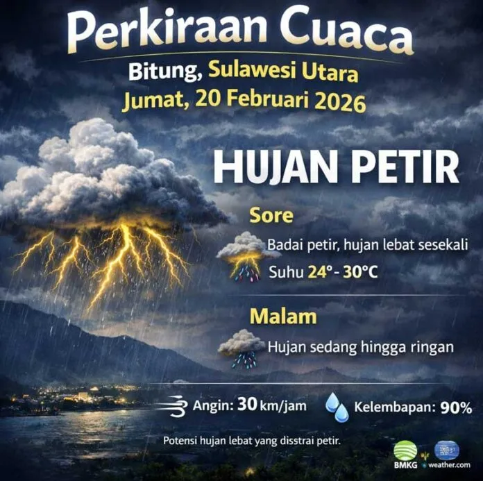 - Siang hingga sore: Potensi badai petir dengan hujan lebat sesekali di siang hari di Bitung. Cuaca panas lembap dengan kemungkinan hujan petir cukup besar.