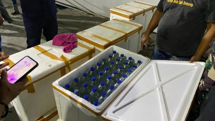 Dari hasil pemeriksaan diketahui setiap cool box berisi 32 botol air mineral ukuran 1,5 liter yang telah diisi minyak tanah. Total BBM yang ditemukan diperkirakan mencapai sekitar 624 liter.